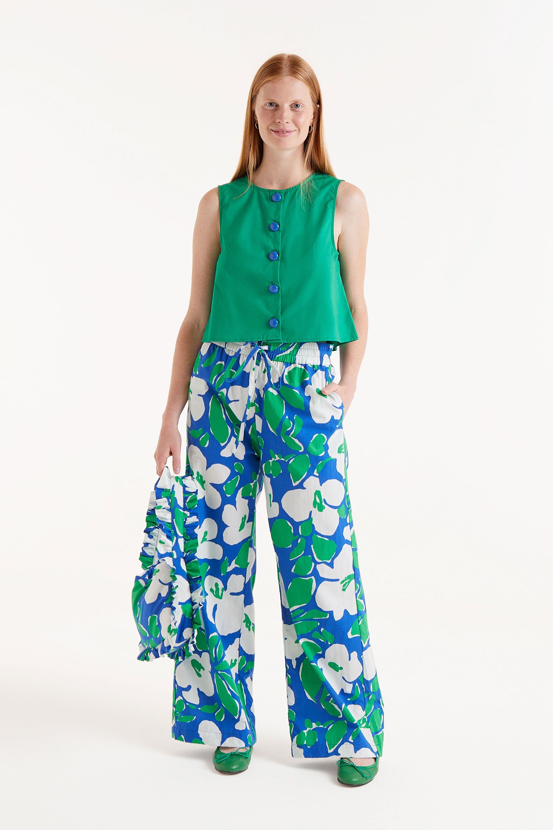 Trousers in cotton poplin with a Bosco floral print. Elasticated waist and straight leg. Adjustable waist with drawstring.